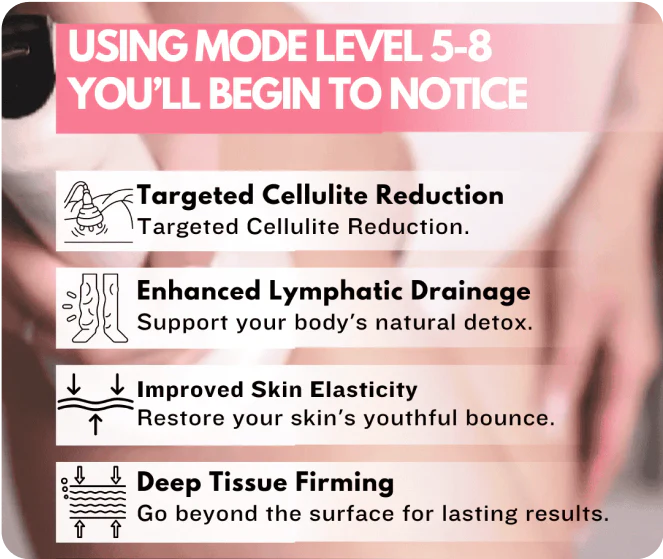Levels 1 through to 4 provide a soothing and light massage, perfect for beginners or those with sensitive skin. These levels gradually increase blood circulation, relax the skin, and start breaking down the early stages of cellulite with a soft touch.
